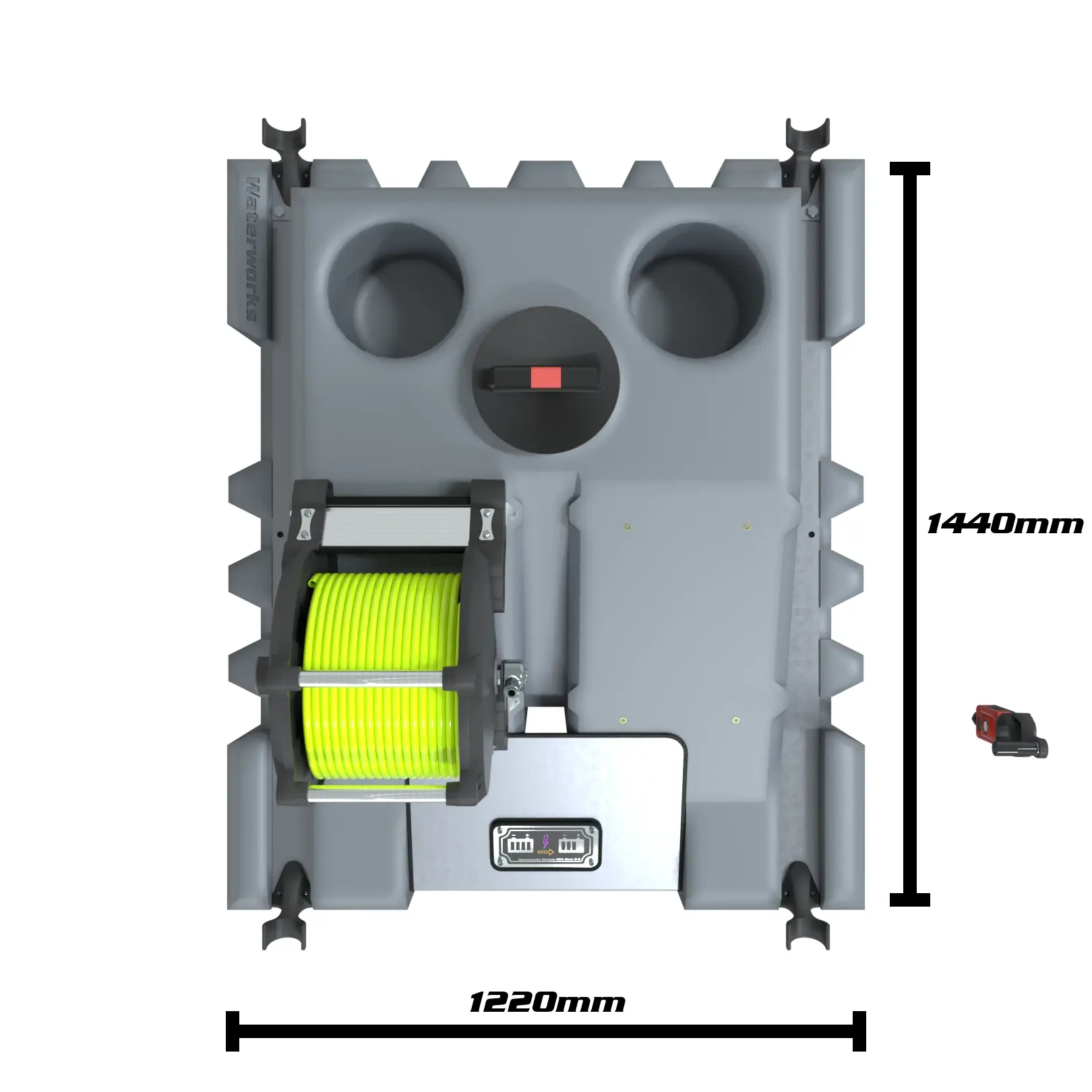 The system features a high-capacity 1000L Waterworks tank, crafted from over 20 years of industry expertise in premium window cleaning products. This tank is made from thick, durable polyethylene and includes pre-moulded fixing positions for easy upgrades. Its substantial capacity ensures longer cleaning sessions, making it ideal for high-demand jobs.