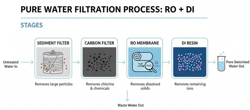 - In medium to hard-water areas, an RO/DI setup is recommended — the RO membrane removes most minerals before the DI resin polishes the water.